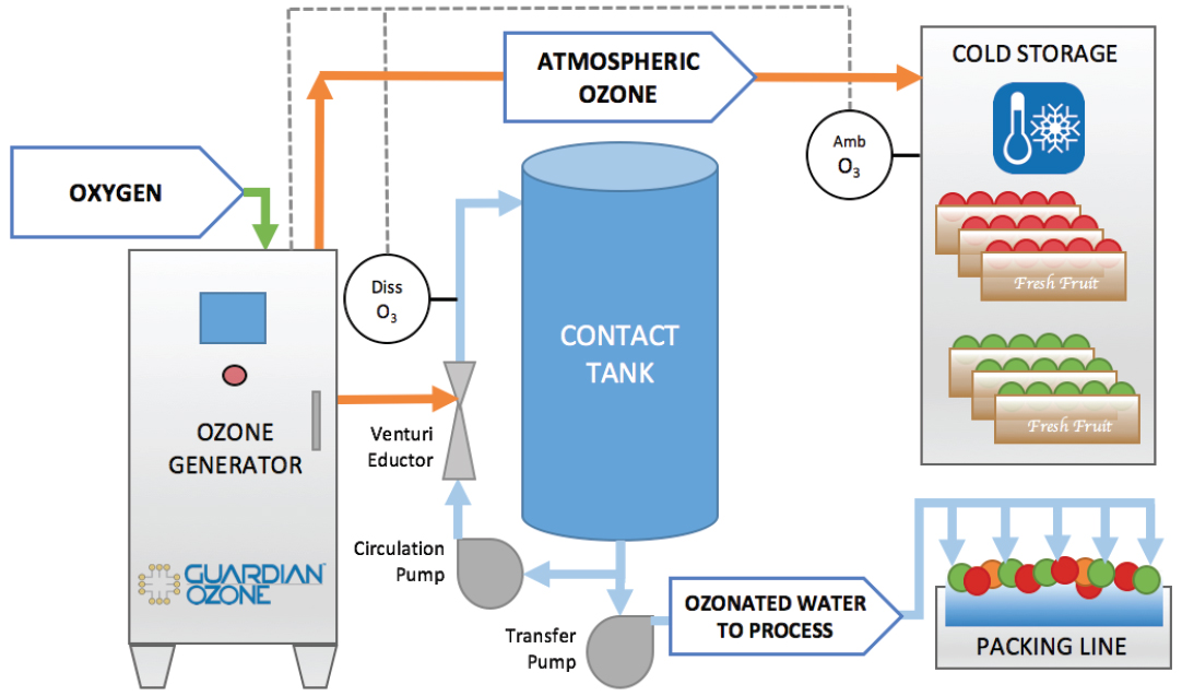 Many growers and packers have found that maintaining fruit storage in an atmosphere with a low concentration of gaseous ozone can significantly improve produce quality and sanitation. Ozonating water for tree fruit packing lines has proven to be the most effective intervention as an antimicrobial agent.